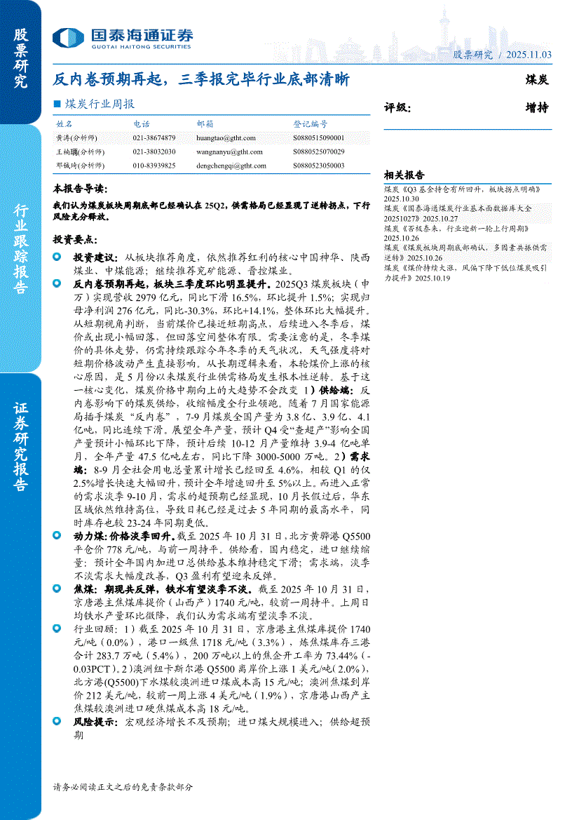 煤炭行业:国泰海通证券-煤炭行业周报:反内卷预期再起,三季报完毕行业底部清晰-251103