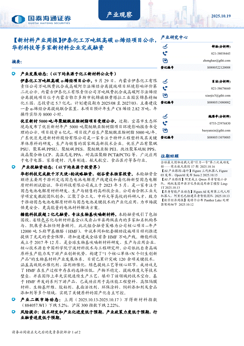国泰海通证券-产业观察:【新材料产业周报】伊泰化工万吨级高碳α~烯烃项目公示,华彩科技等多家新材料企业完成融资-251019
