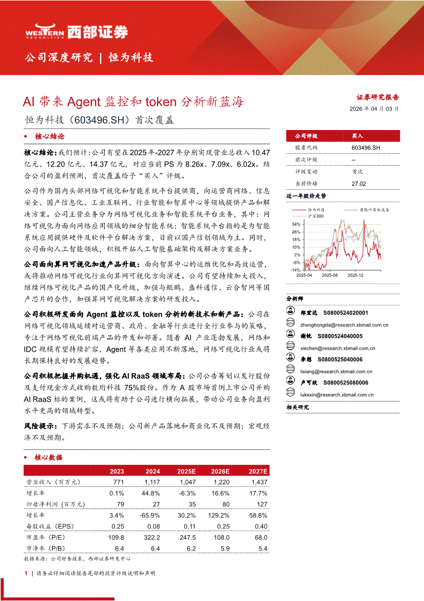 恒为科技:西部证券-恒为科技-603496-首次覆盖:AI带来Agent监控和token分析新蓝海-260403