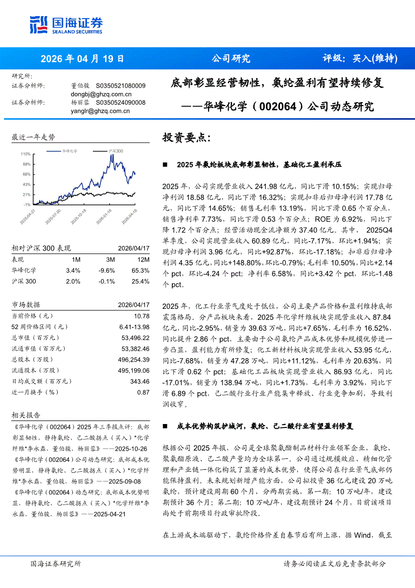 华峰化学:国海证券-华峰化学-002064-公司动态研究:底部彰显经营韧性,氨纶盈利有望持续修复-260419