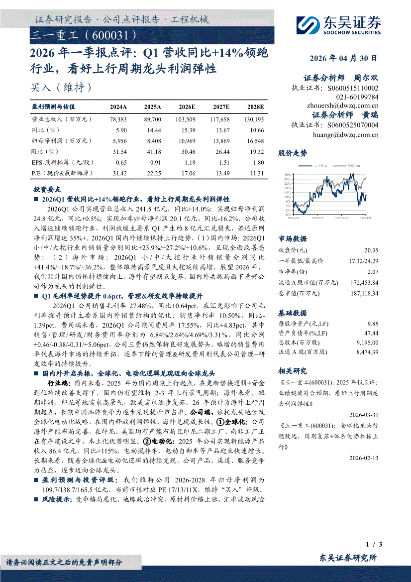三一重工:东吴证券-三一重工-600031-2026年一季报点评:Q1营收同比+14%领跑行业,看好上行周期龙头利润弹性-260430