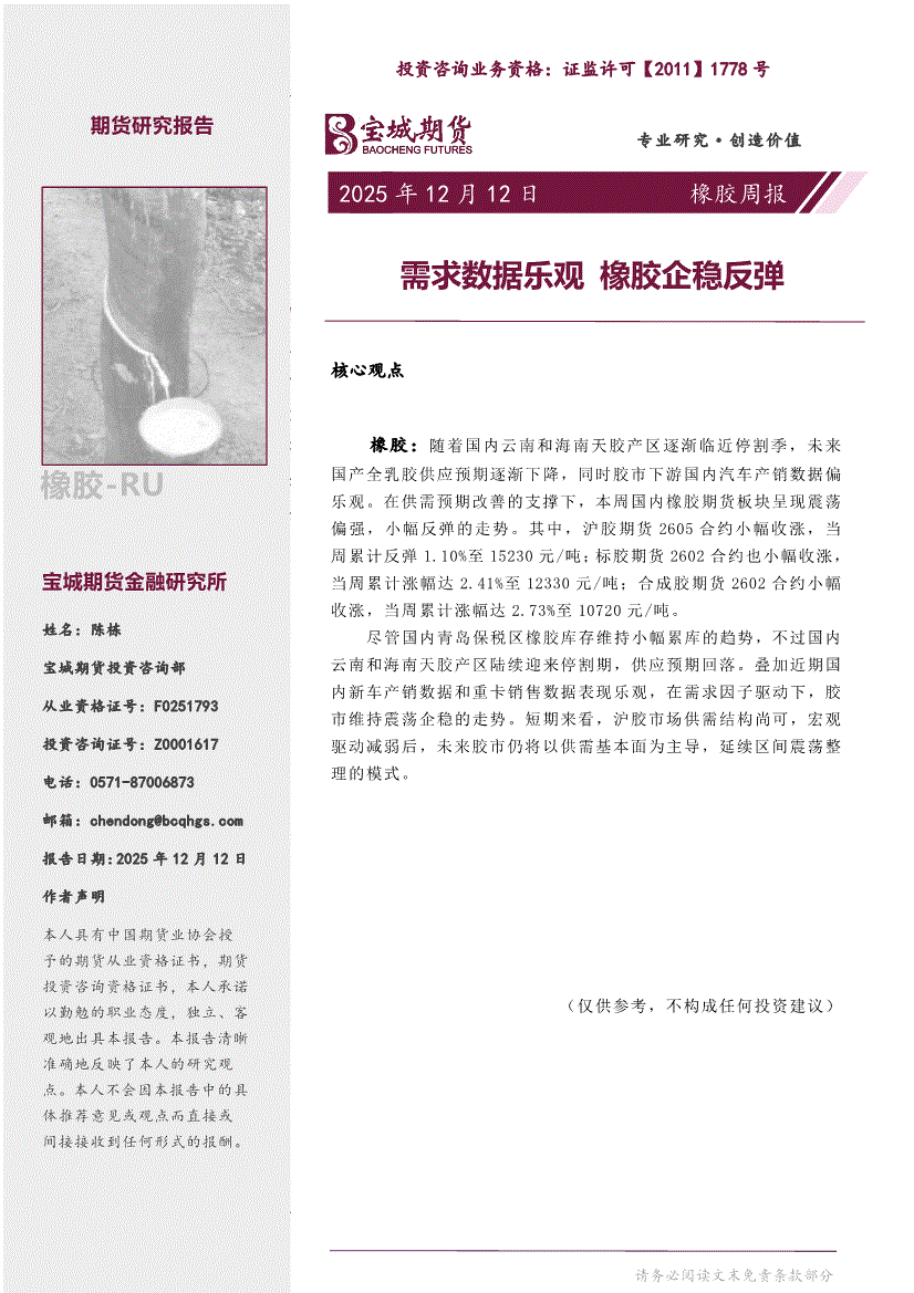 宝城期货-橡胶周报:需求数据乐观,橡胶企稳反弹-251212