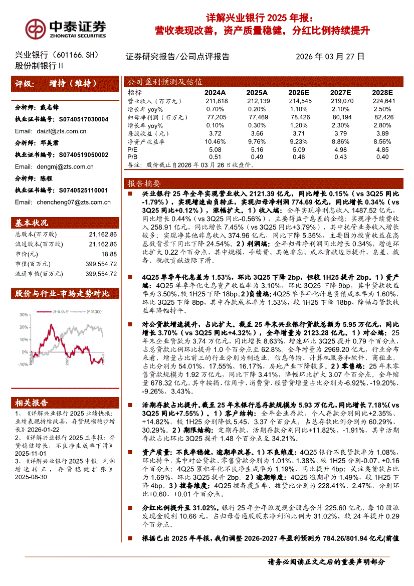 兴业银行:中泰证券-兴业银行-601166-详解兴业银行2025年报:营收表现改善,资产质量稳健,分红比例持续提升-260327