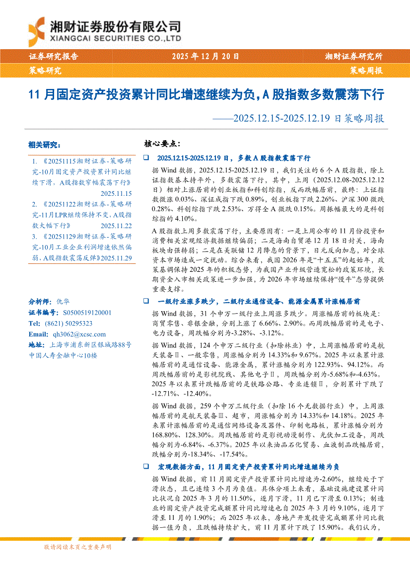 湘财证券-策略周报:11月固定资产投资累计同比增速继续为负,A股指数多数震荡下行-251220