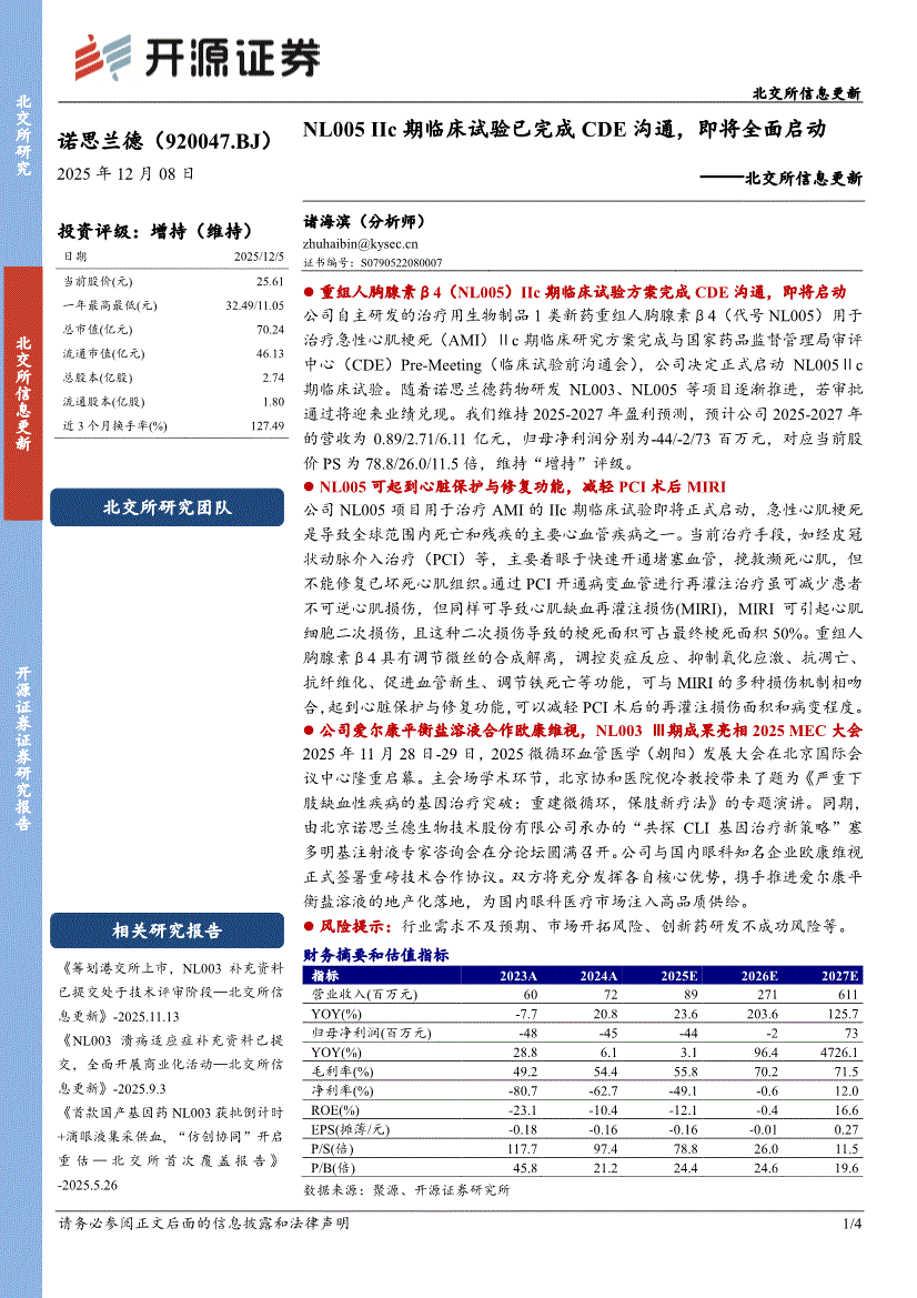 诺思兰德:开源证券-诺思兰德-920047-北交所信息更新:NL005 IIc期临床试验已完成CDE沟通,即将全面启动-251208