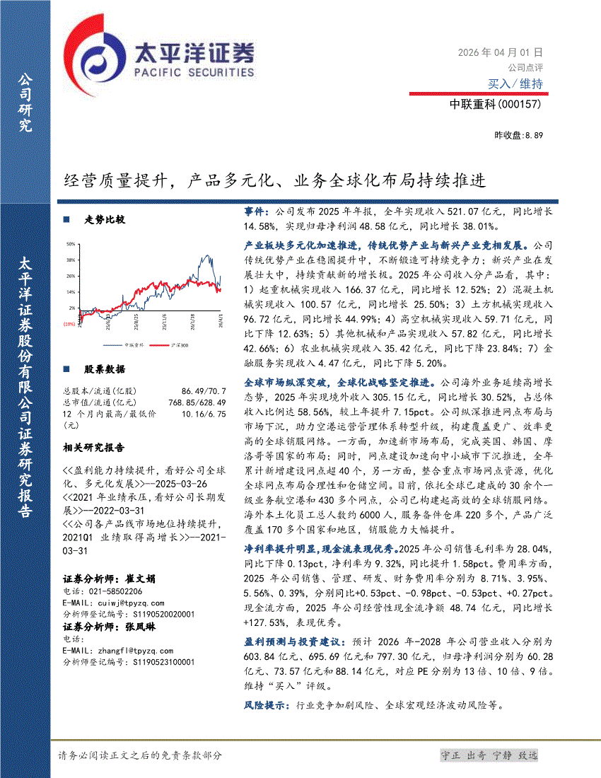 中联重科:太平洋证券-中联重科-000157-经营质量提升,产品多元化、业务全球化布局持续推进-260401