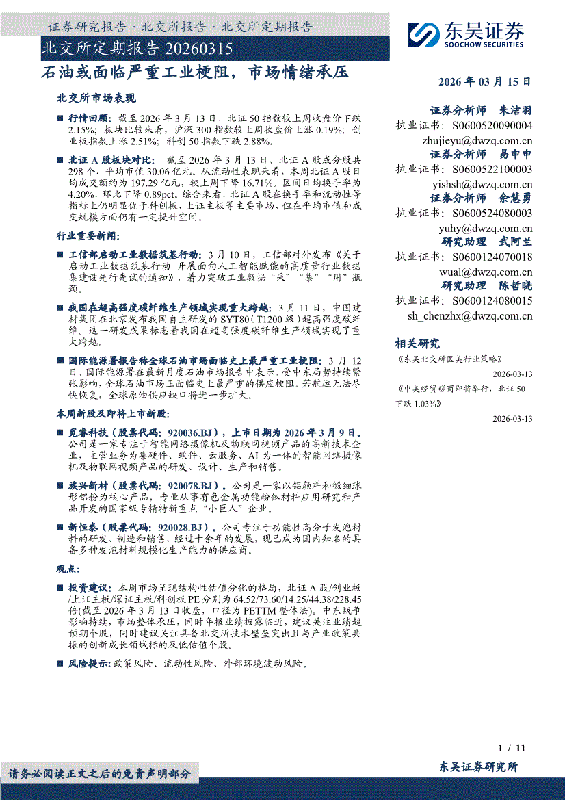 东吴证券-北交所定期报告:石油或面临严重工业梗阻,市场情绪承压-260315