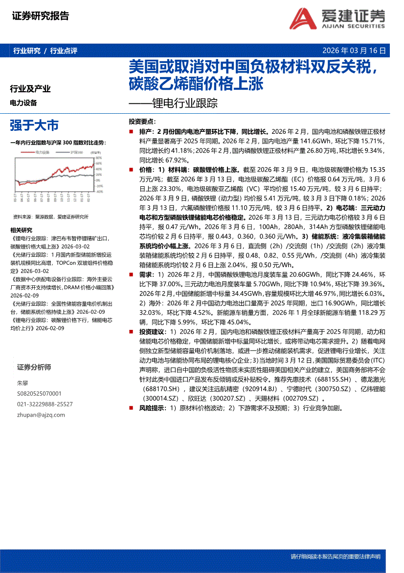 锂电行业:爱建证券-锂电行业跟踪:美国或取消对中国负极材料双反关税,碳酸乙烯酯价格上涨-260316
