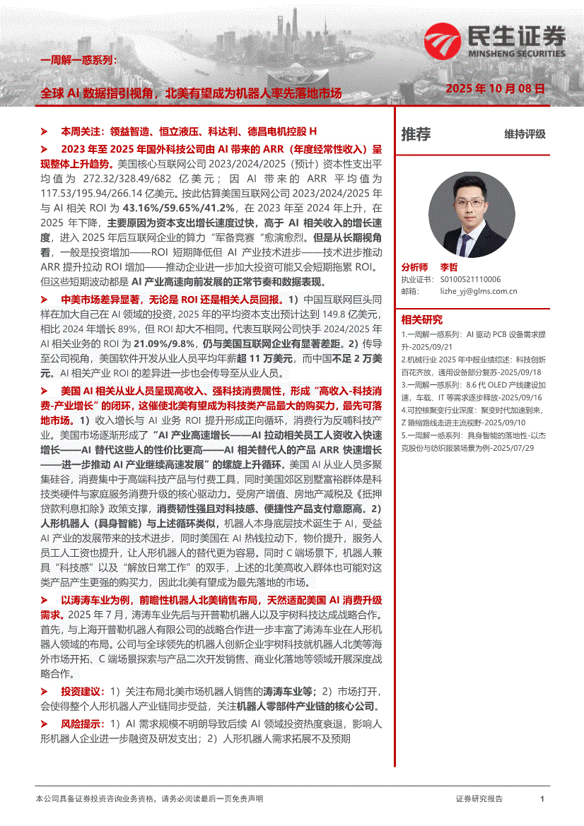 机械行业:民生证券-机械行业一周解一惑系列:全球Ai数据指引视角,北美有望成为机器人率先落地市场-251008