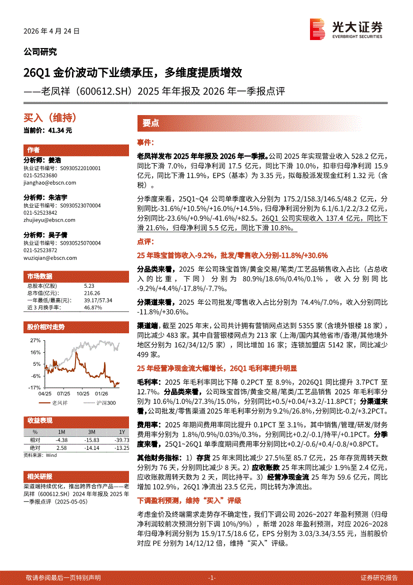 老凤祥:光大证券-老凤祥-600612-2025年年报及2026年一季报点评:26Q1金价波动下业绩承压,多维度提质增效-260424