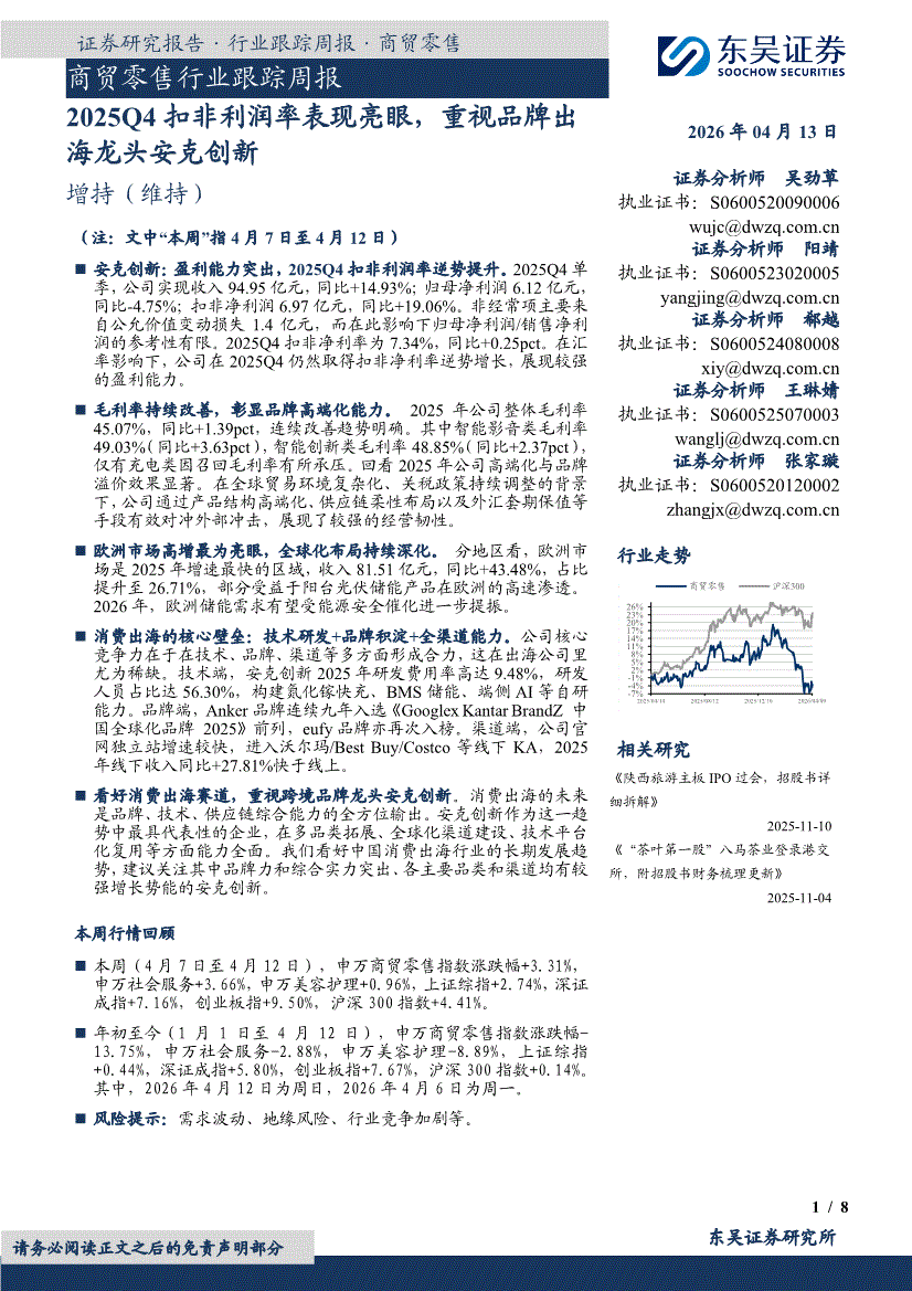 商贸零售行业:东吴证券-商贸零售行业跟踪周报:2025Q4扣非利润率表现亮眼,重视品牌出海龙头安克创新-260413