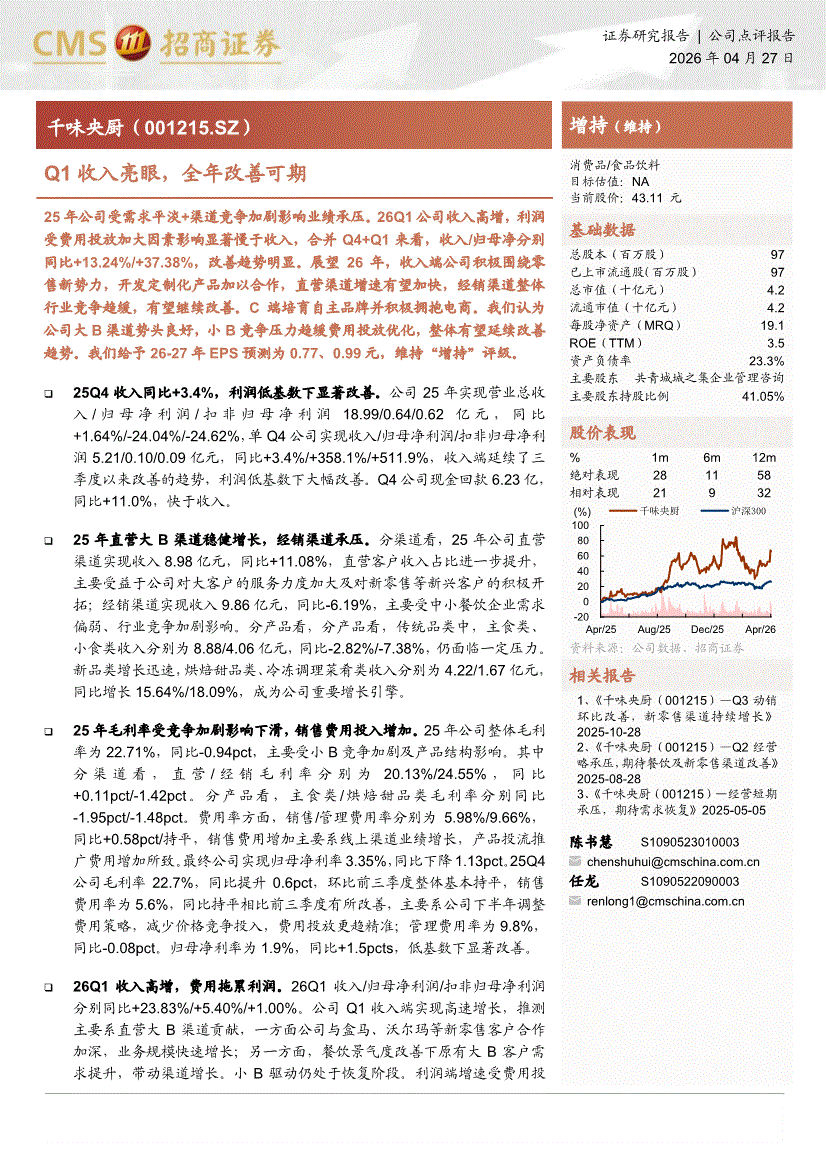 千味央厨:招商证券-千味央厨-001215-Q1收入亮眼,全年改善可期-260427