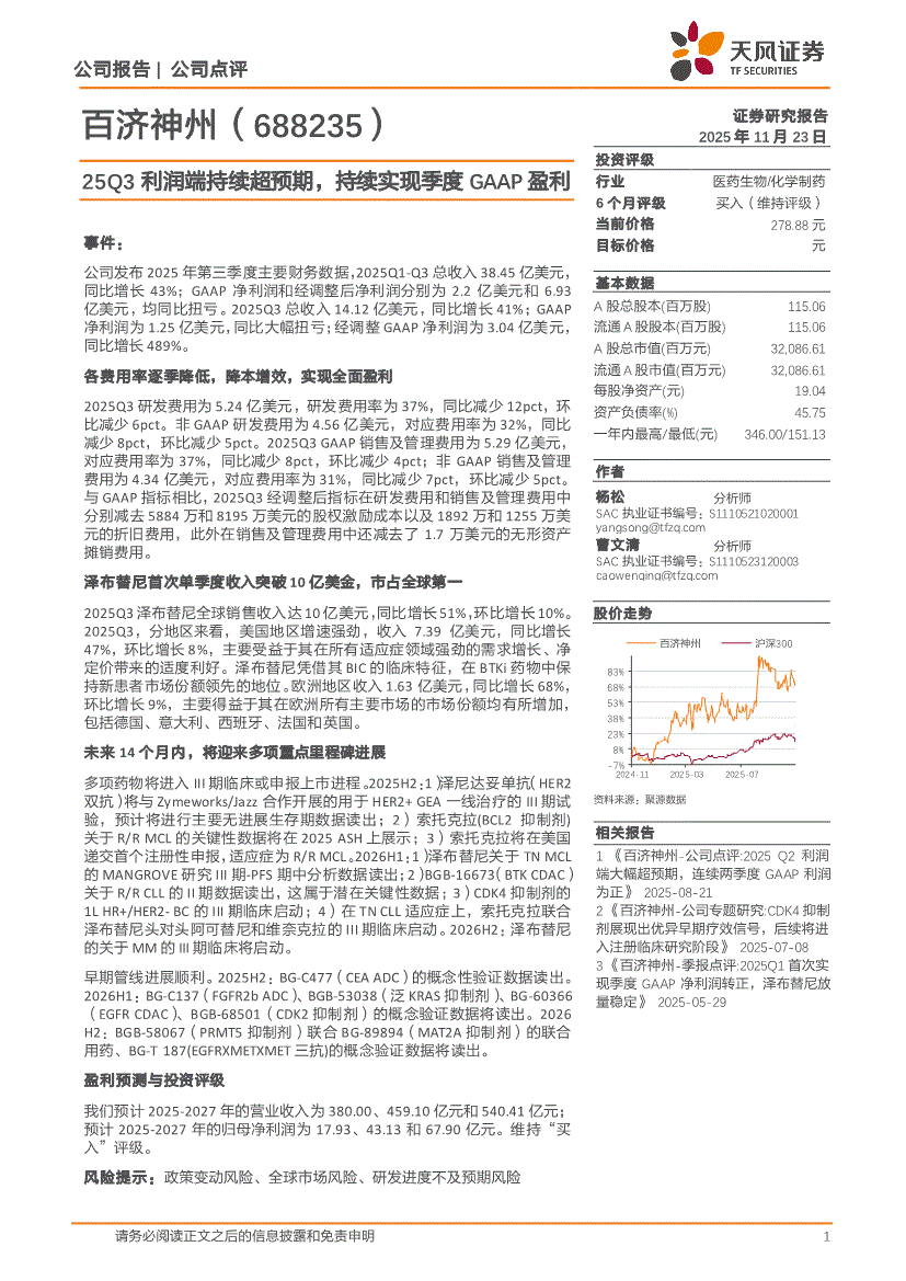 百济神州:天风证券-百济神州-688235-25Q3利润端持续超预期,持续实现季度GAAP盈利-251123