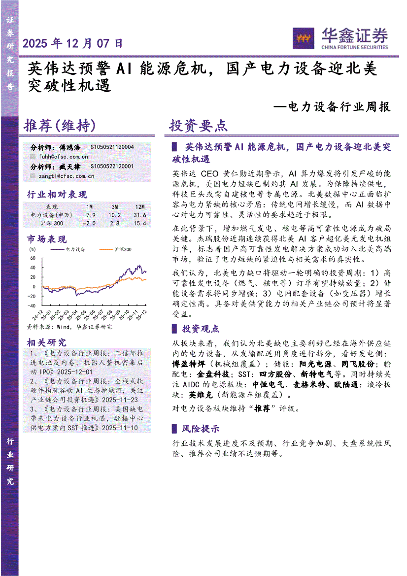 电力设备行业:华鑫证券-电力设备行业周报:英伟达预警AI能源危机,国产电力设备迎北美突破性机遇-251207