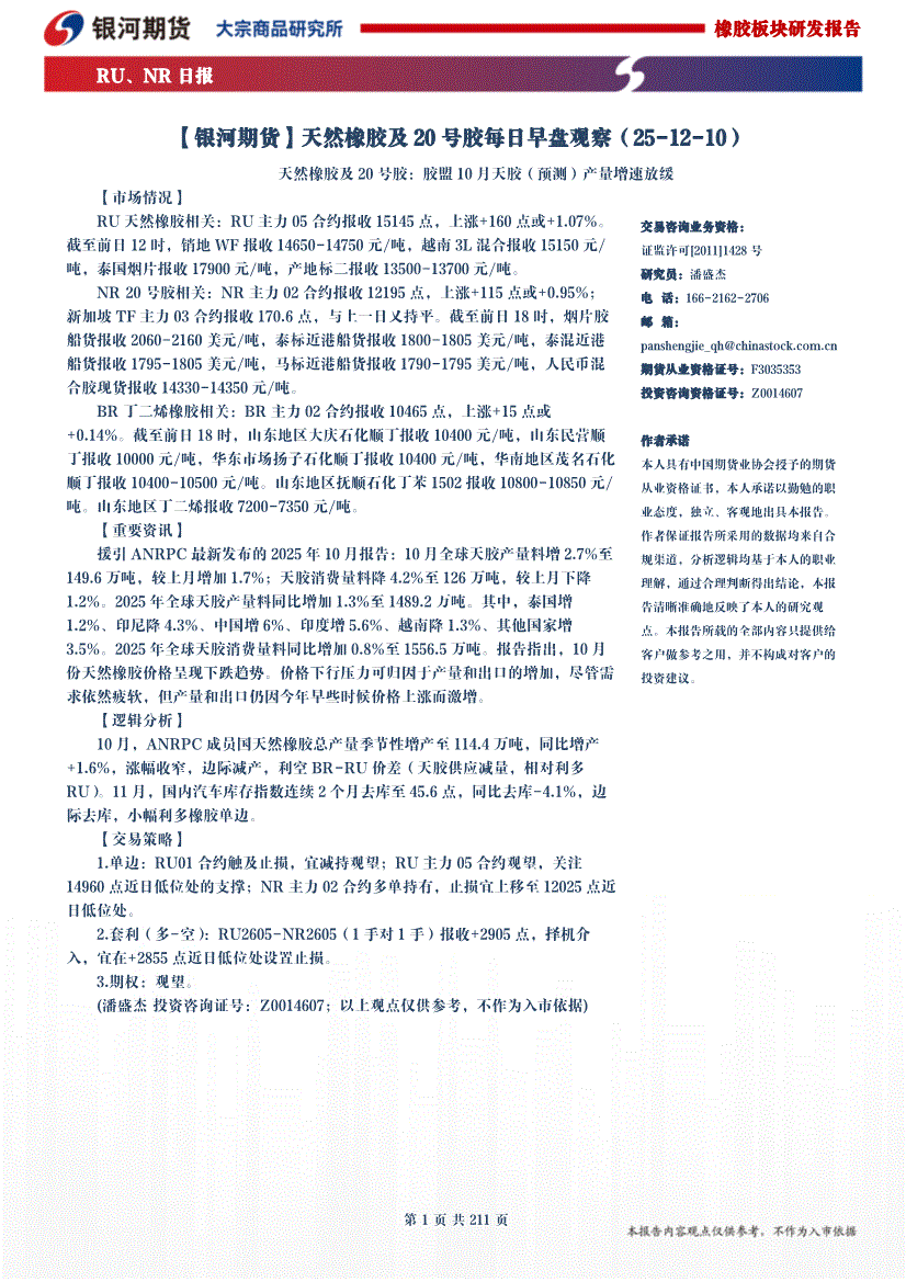 银河期货-天然橡胶及20号胶每日早盘观察-251210