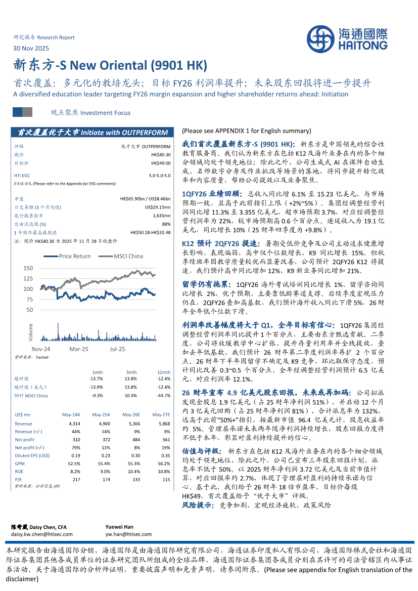 新东方~S:海通国际-新东方~S-9901.HK-首次覆盖:多元化的教培龙头;目标FY26利润率提升;未来股东回报将进一步提升-251130