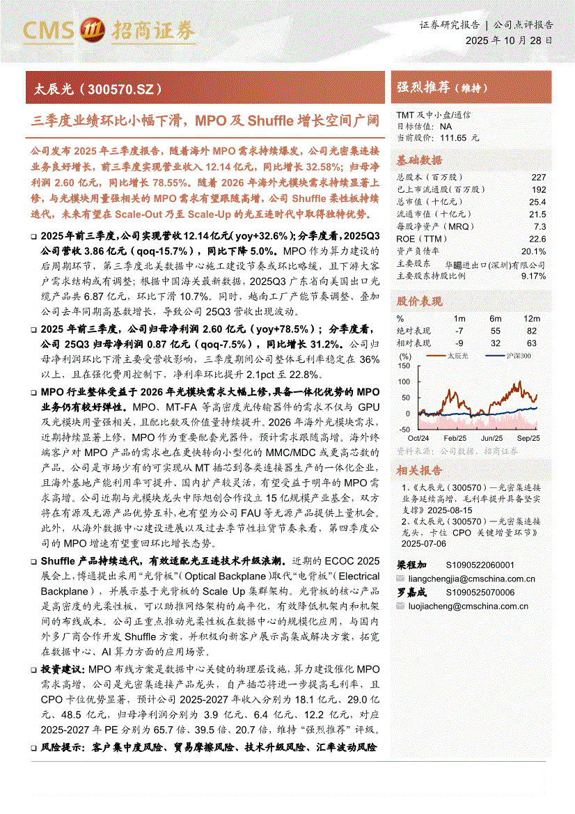 太辰光:招商证券-太辰光-300570-三季度业绩环比小幅下滑,MPO及Shuffle增长空间广阔-251028