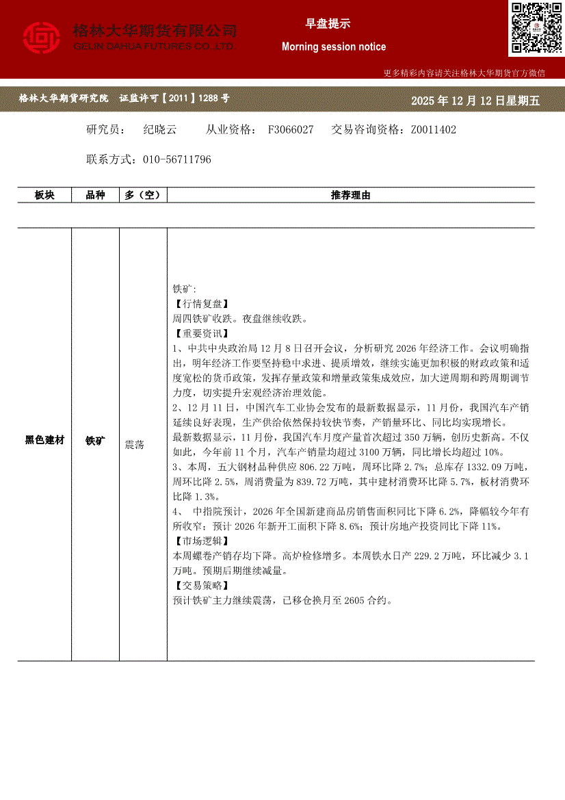 格林大华期货-铁矿早盘提示-251205