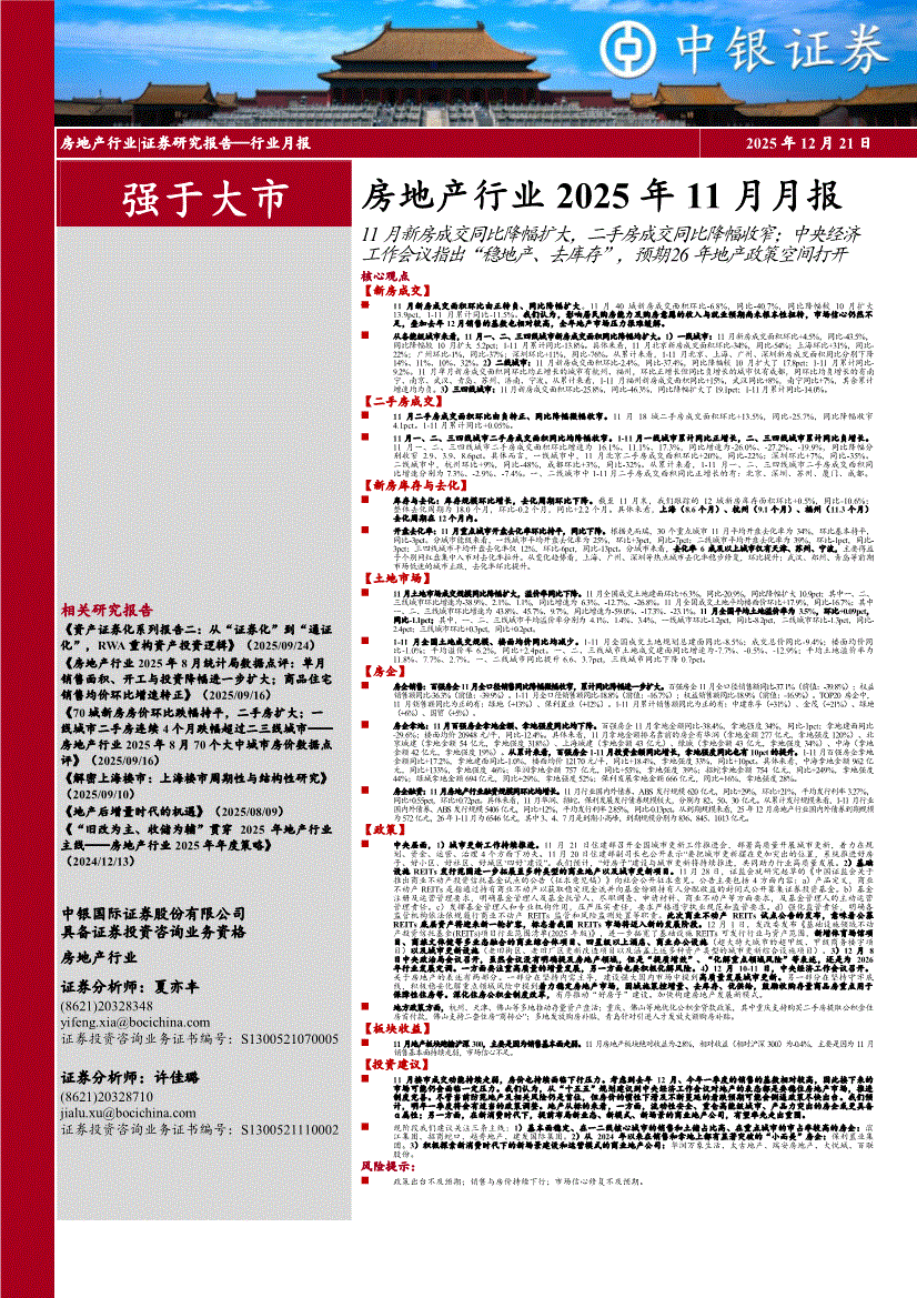房地产行业:中银国际-房地产行业2025年11月月报:11月新房成交同比降幅扩大,二手房成交同比降幅收窄;中央经济工作会议指出“稳地产、去库存”,预期26年地产政策空间打开-251221