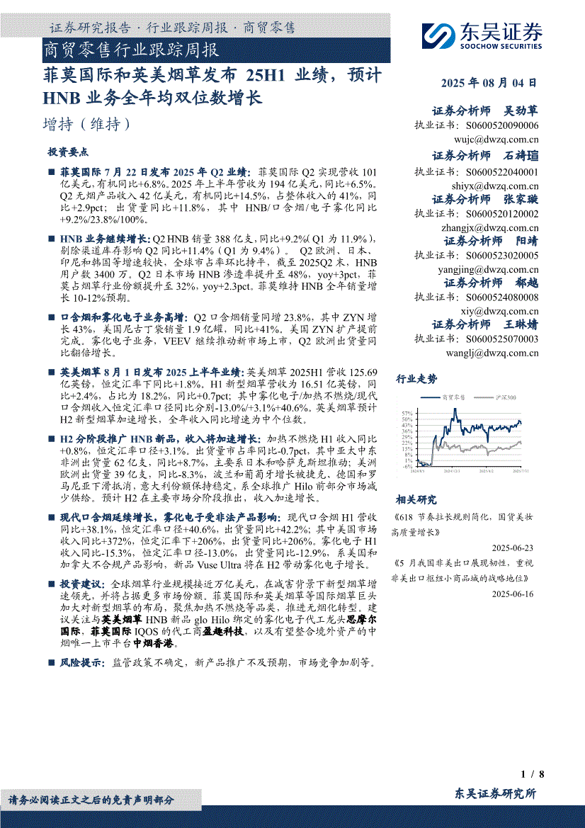 商贸零售行业:东吴证券-商贸零售行业跟踪周报:菲莫国际和英美烟草发布25H1业绩,预计HNB业务全年均双位数增长-250804