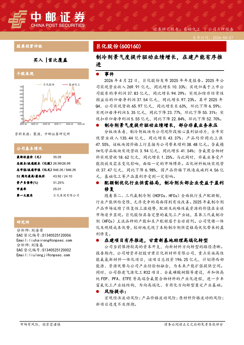 巨化股份:中邮证券-巨化股份-600160-制冷剂景气度提升驱动业绩增长,在建产能有序推进-260427