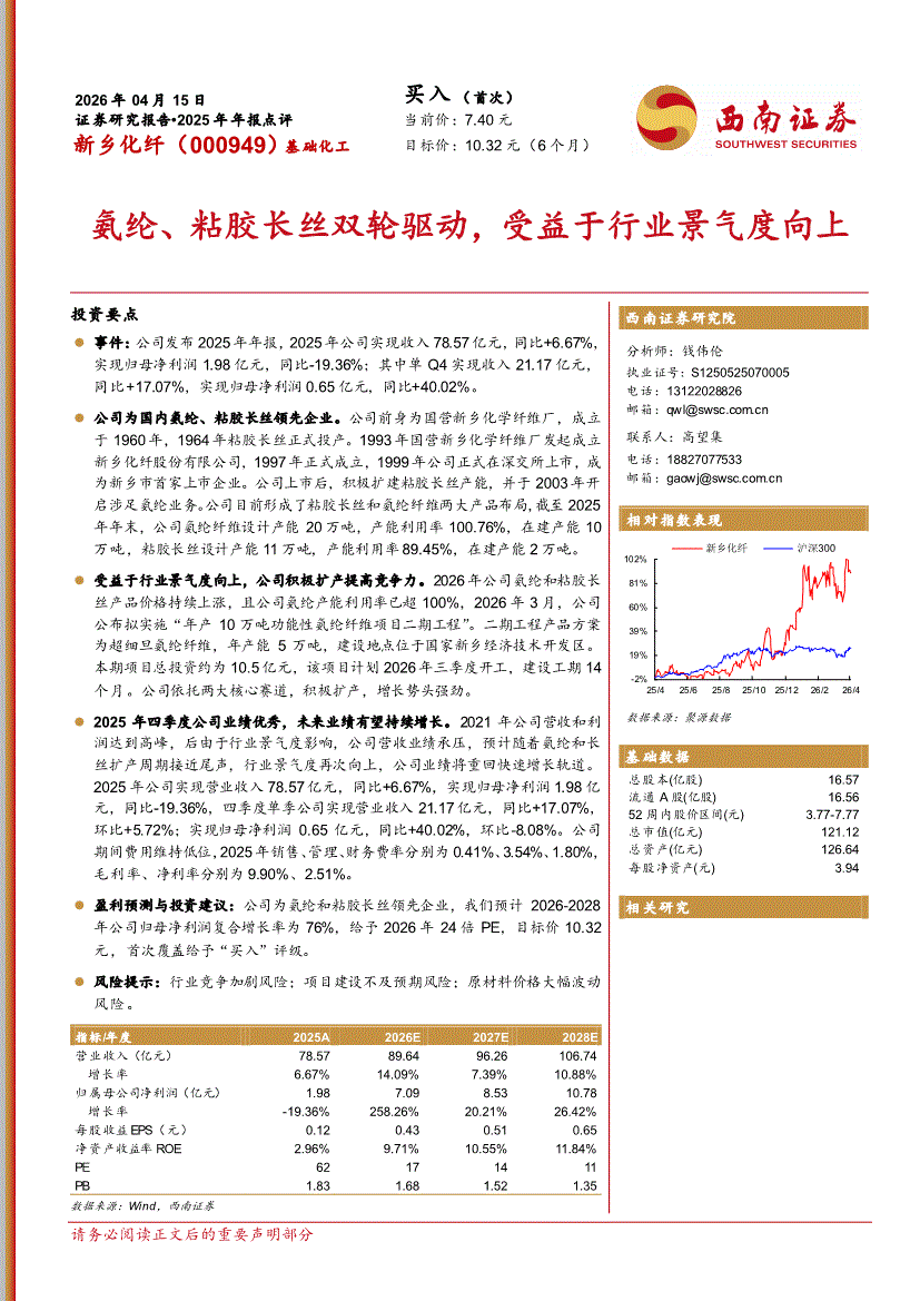 新乡化纤:西南证券-新乡化纤-000949-氨纶、粘胶长丝双轮驱动,受益于行业景气度向上-260415