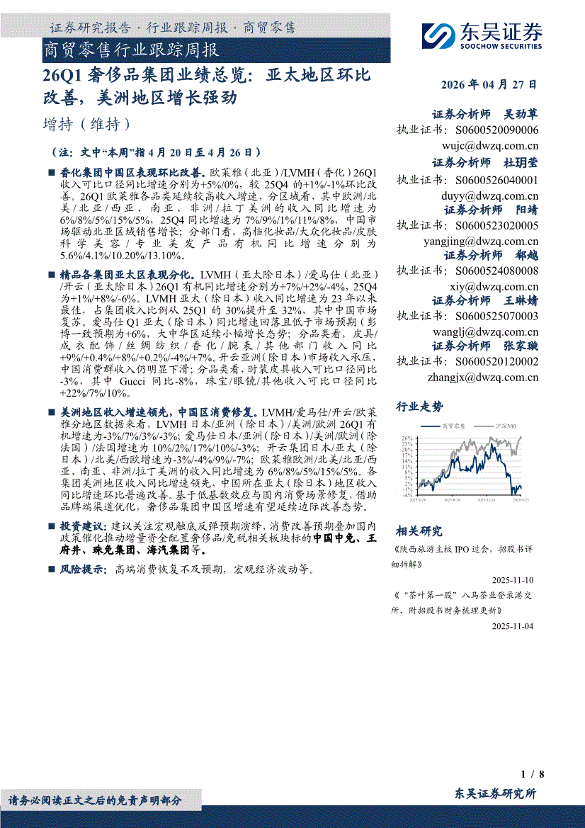 商贸零售行业:东吴证券-商贸零售行业跟踪周报:26Q1奢侈品集团业绩总览,亚太地区环比改善,美洲地区增长强劲-260427