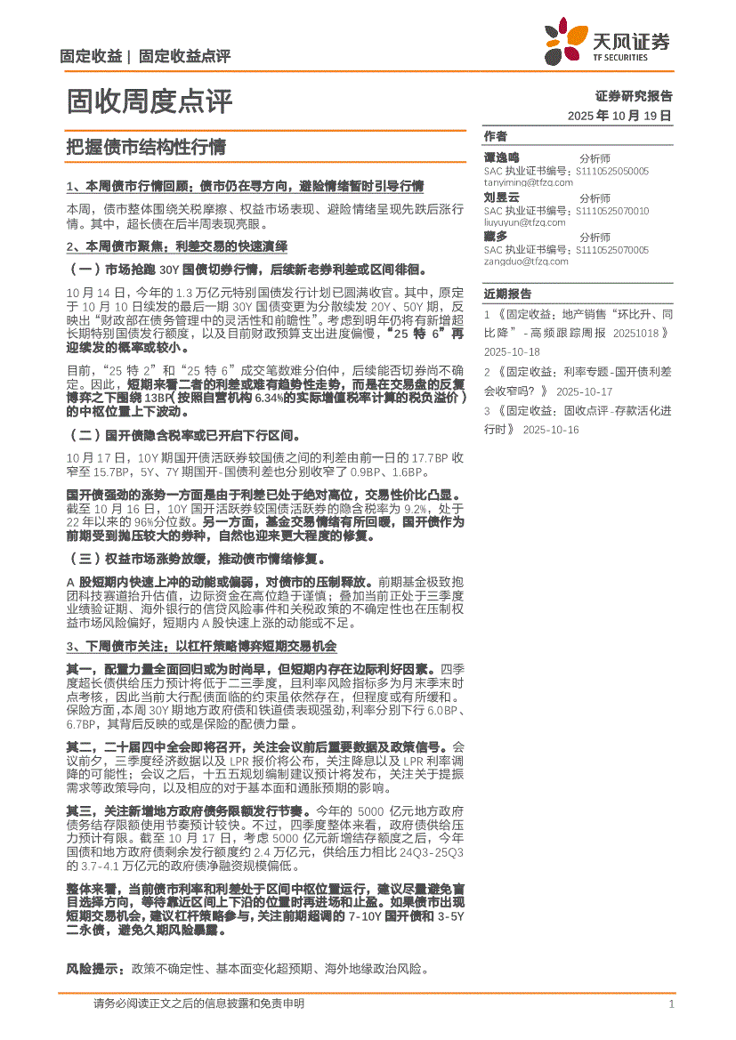 天风证券-固收周度点评:把握债市结构性行情-251019