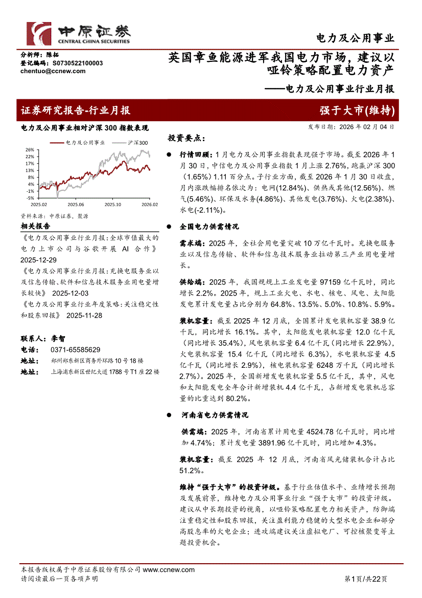 电力及公用事业行业:中原证券-电力及公用事业行业月报:英国章鱼能源进军我国电力市场,建议以哑铃策略配置电力资产-260204