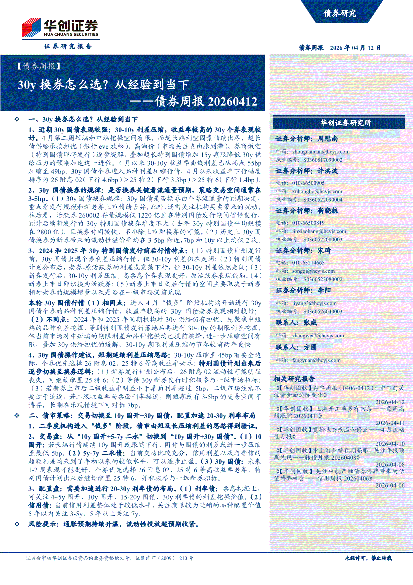 华创证券-债券周报:30y换券怎么选?从经验到当下-260412