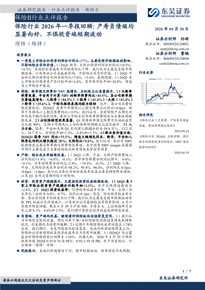 保险行业:东吴证券-保险行业2026年一季报回顾:产寿负债端均显著向好,不惧投资端短期波动-260430