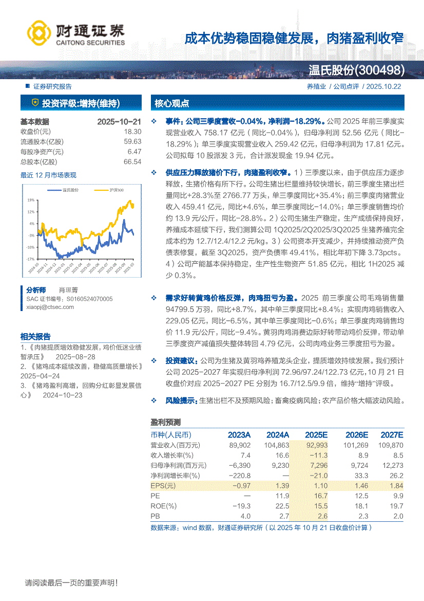 温氏股份:财通证券-温氏股份-300498-成本优势稳固稳健发展,肉猪盈利收窄-251022