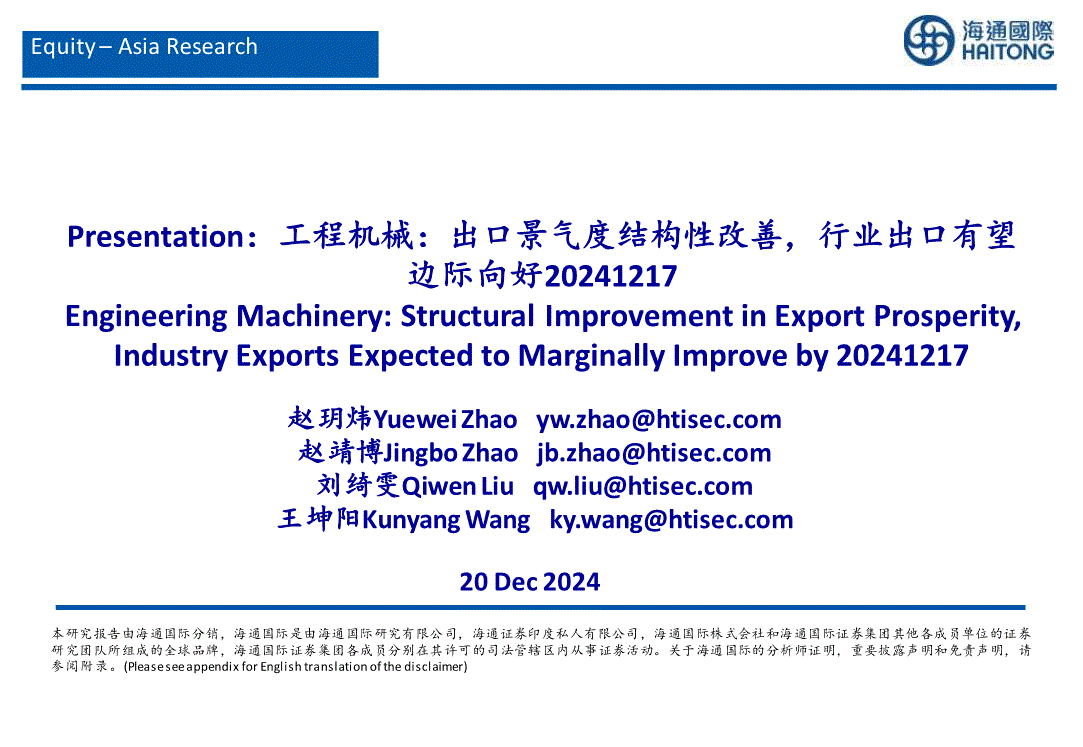 工程机械行业:海通国际-工程机械行业:出口景气度结构性改善,行业出口有望边际向好-241220
