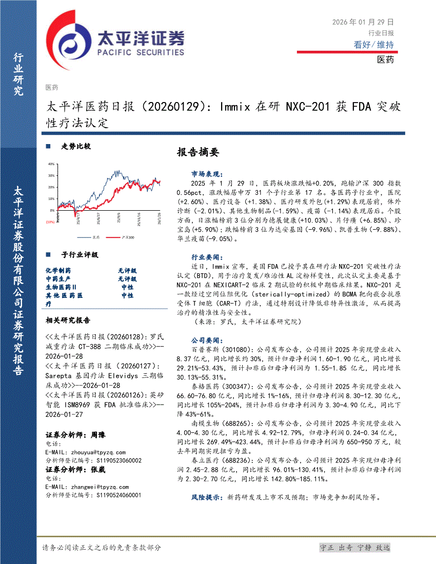 医药行业:太平洋证券-医药行业日报:Immix在研NXC~201获FDA突破性疗法认定-260129
