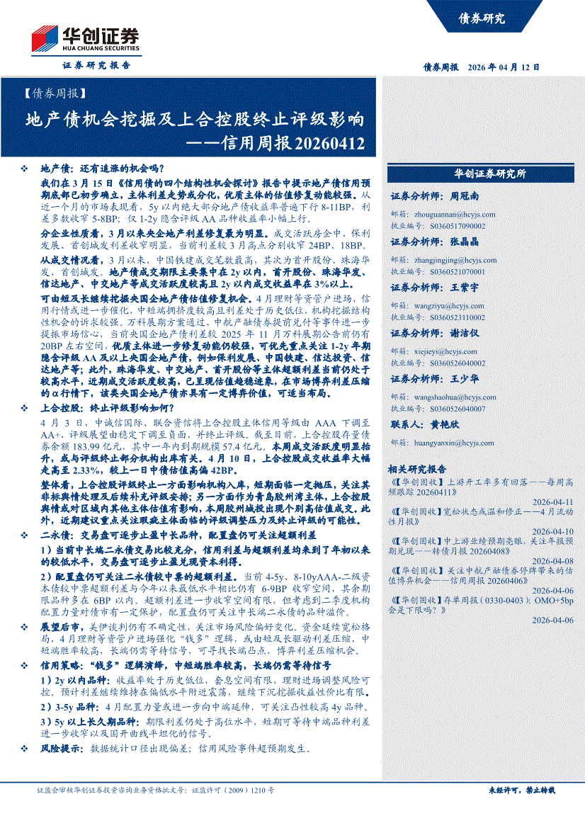 华创证券-【债券周报】信用周报:地产债机会挖掘及上合控股终止评级影响-260412