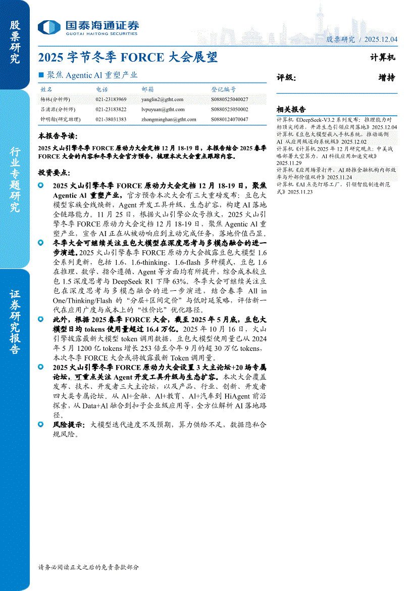 计算机行业:国泰海通证券-计算机行业聚焦Agentic Al重塑产业:2025字节冬季FORCE大会展望-251204