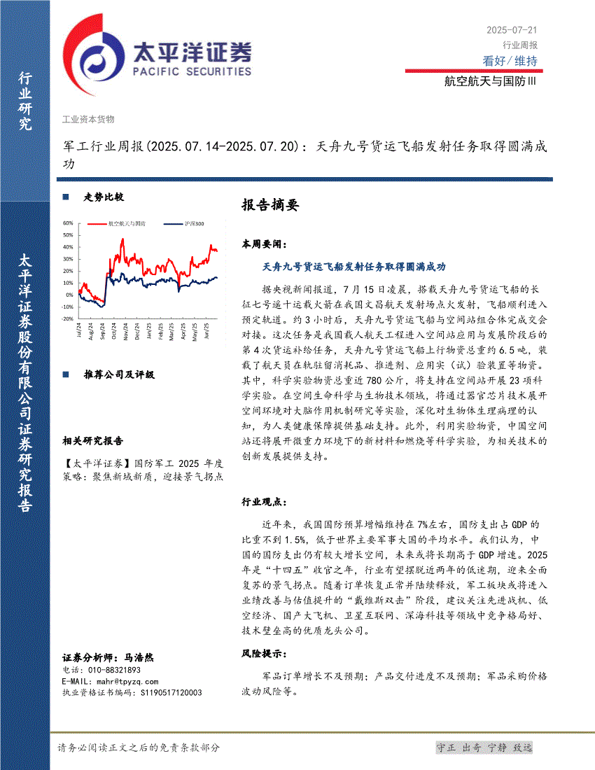 军工行业:太平洋证券-军工行业周报(2025.07.14~2025.07.20):天舟九号货运飞船发射任务取得圆满成功-250721