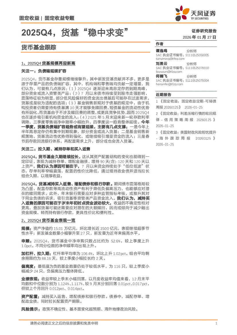 天风证券-货币基金跟踪:2025Q4,货基“稳中求变”-260127