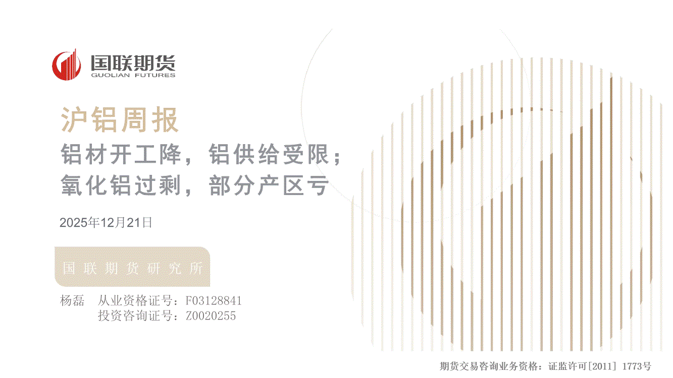 国联期货-沪铝周报:电解铝供给受限但铝材开工降;氧化铝部分产区亏损-251214