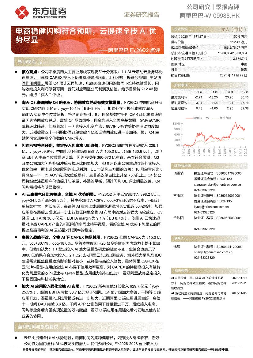 阿里巴巴~W:东方证券-阿里巴巴~W-9988.HK-FY26Q2点评:电商稳健闪购符合预期,云提速全栈AI优势尽显-251129