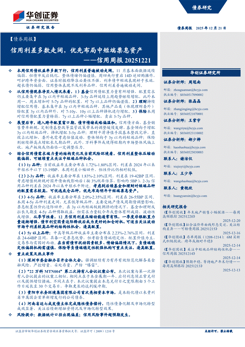华创证券-【债券周报】信用利差多数走阔,优先布局中短端票息资产——信用周报-251221