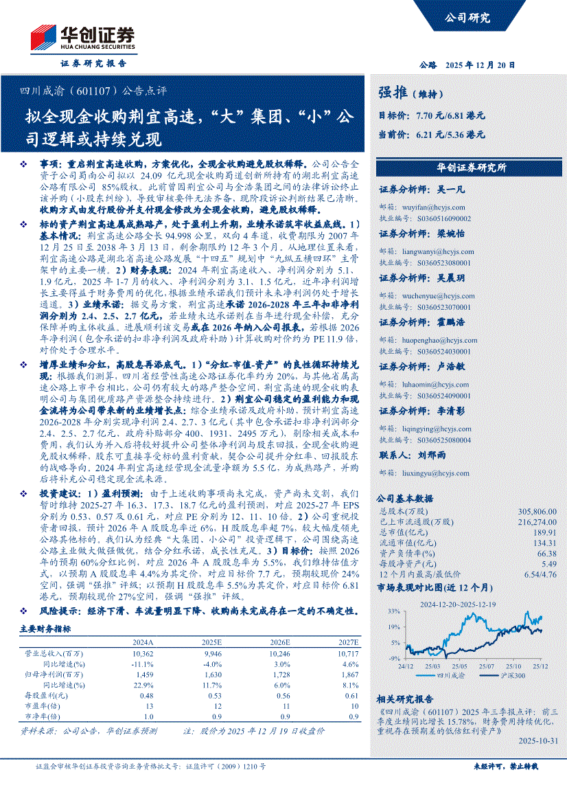 四川成渝:华创证券-四川成渝-601107-公告点评:拟全现金收购荆宜高速,“大”集团、“小”公司逻辑或持续兑现-251220