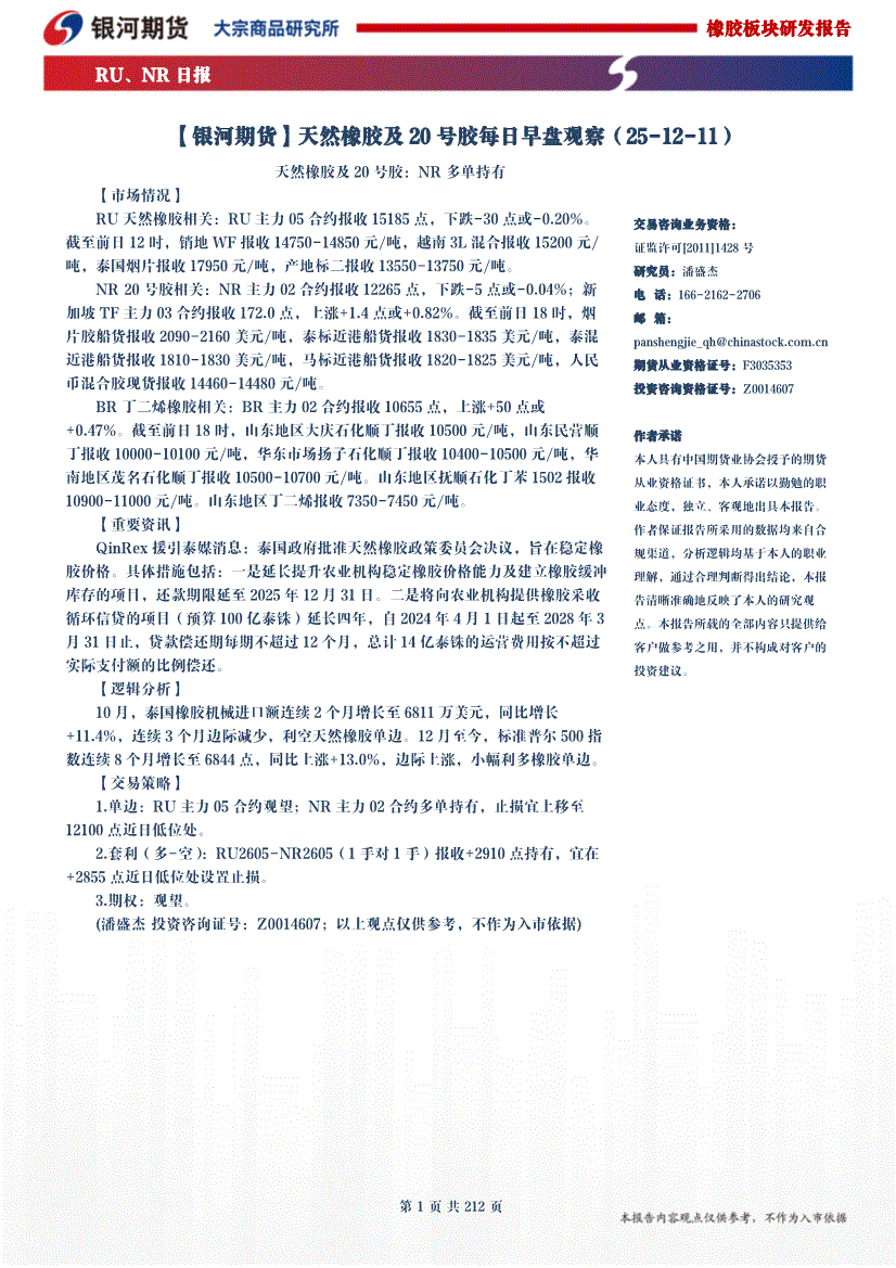 银河期货-天然橡胶及20号胶每日早盘观察-251215