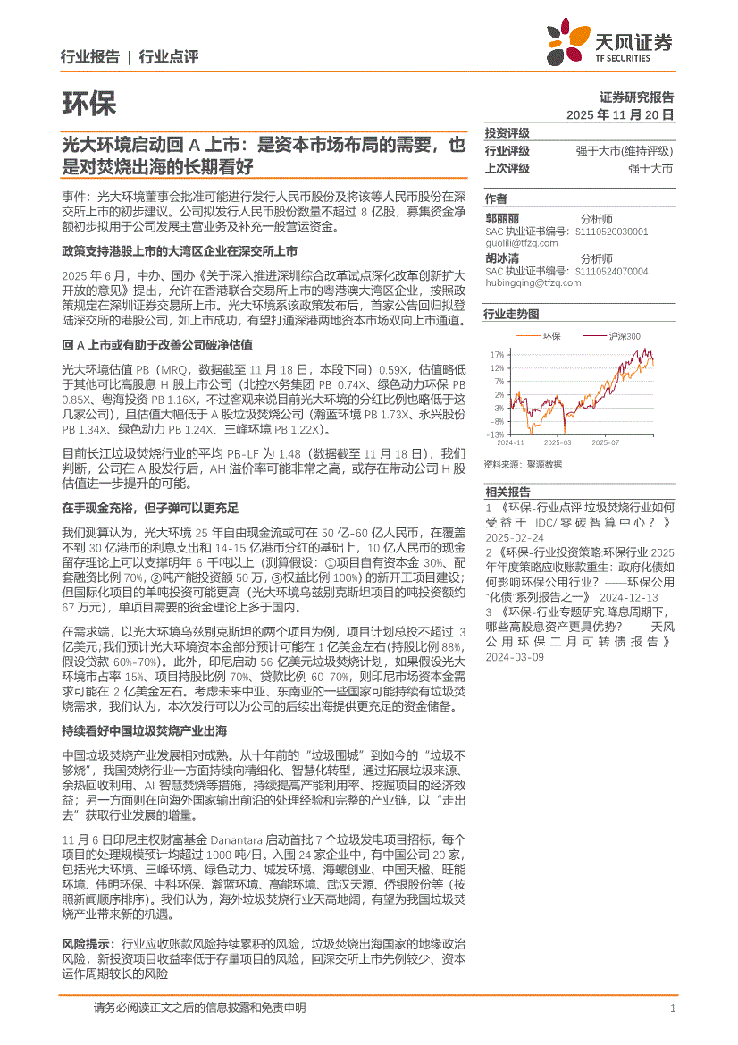 环保行业:天风证券-环保行业光大环境启动回A上市:是资本市场布局的需要,也是对焚烧出海的长期看好-251120