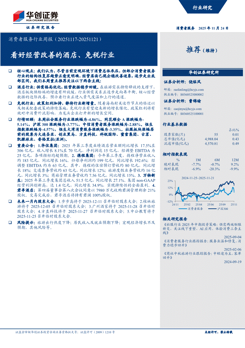 消费者服务行业:华创证券-消费者服务行业周报:看好经营改善的酒店、免税行业-251124