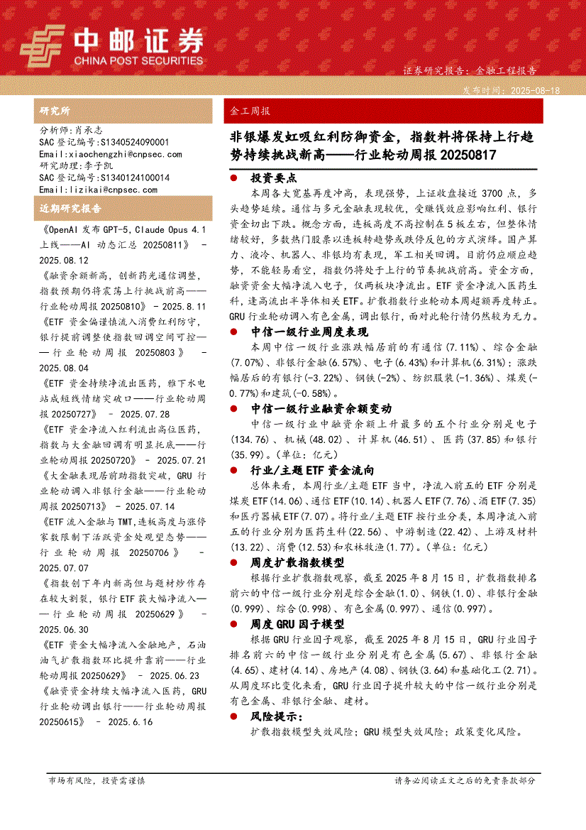 中邮证券-行业轮动周报:非银爆发虹吸红利防御资金,指数料将保持上行趋势持续挑战新高-250818