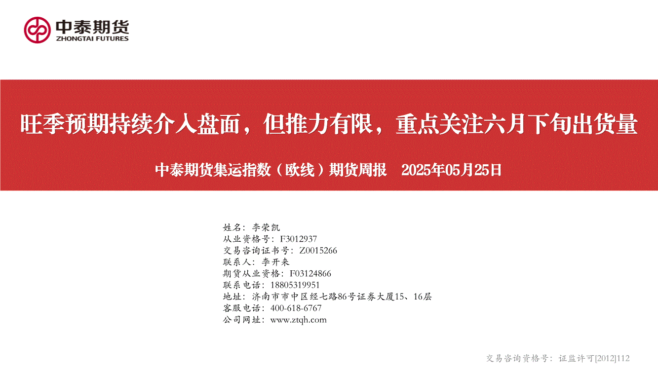 中泰期货-集运指数(欧线)期货周报:旺季预期持续介入盘面,但推力有限,重点关注六月下旬出货量-250525