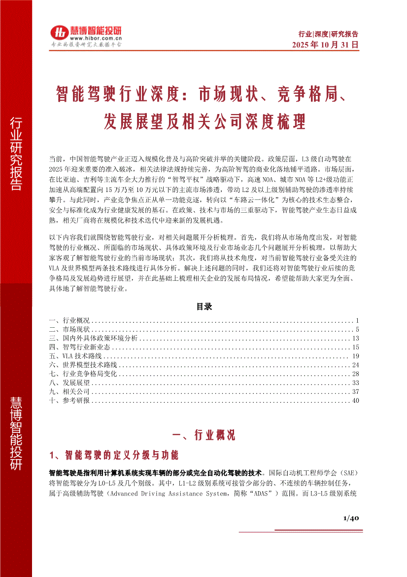 智能驾驶行业:慧博智能投研-智能驾驶行业深度:市场现状、竞争格局、发展展望及相关公司深度梳理-251031