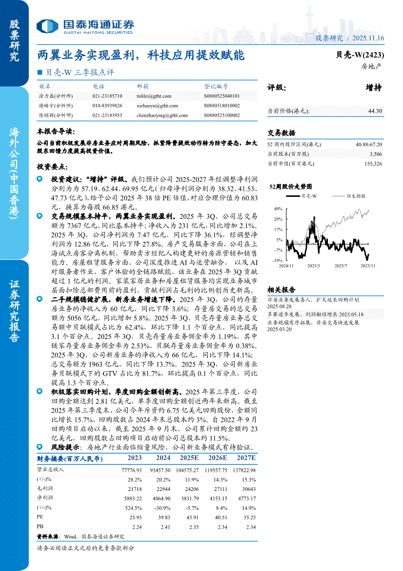 贝壳~W:国泰海通证券-贝壳~W-2423.HK-三季报点评:两翼业务实现盈利,科技应用提效赋能-251116