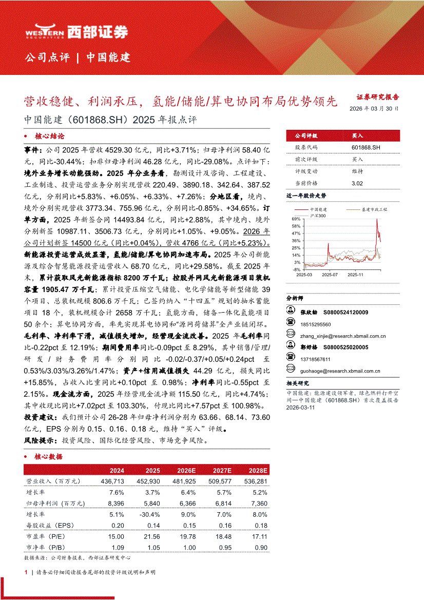 中国能建:西部证券-中国能建-601868-2025年报点评:营收稳健、利润承压,氢能/储能/算电协同布局优势领先-260330